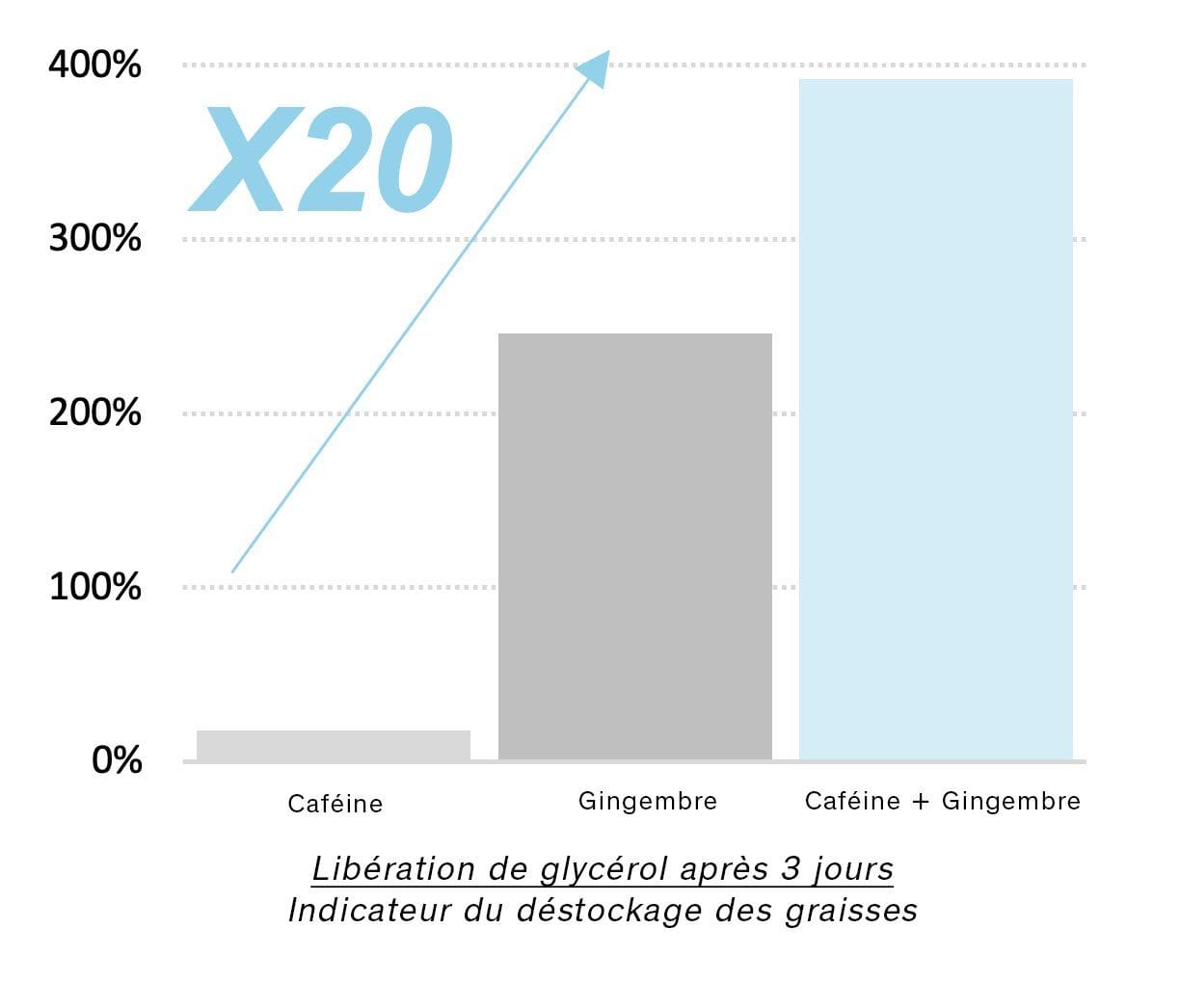 RÉSULTAT : 20X plus efficace que la caféine seule sur le déstockage des graisses.(3)